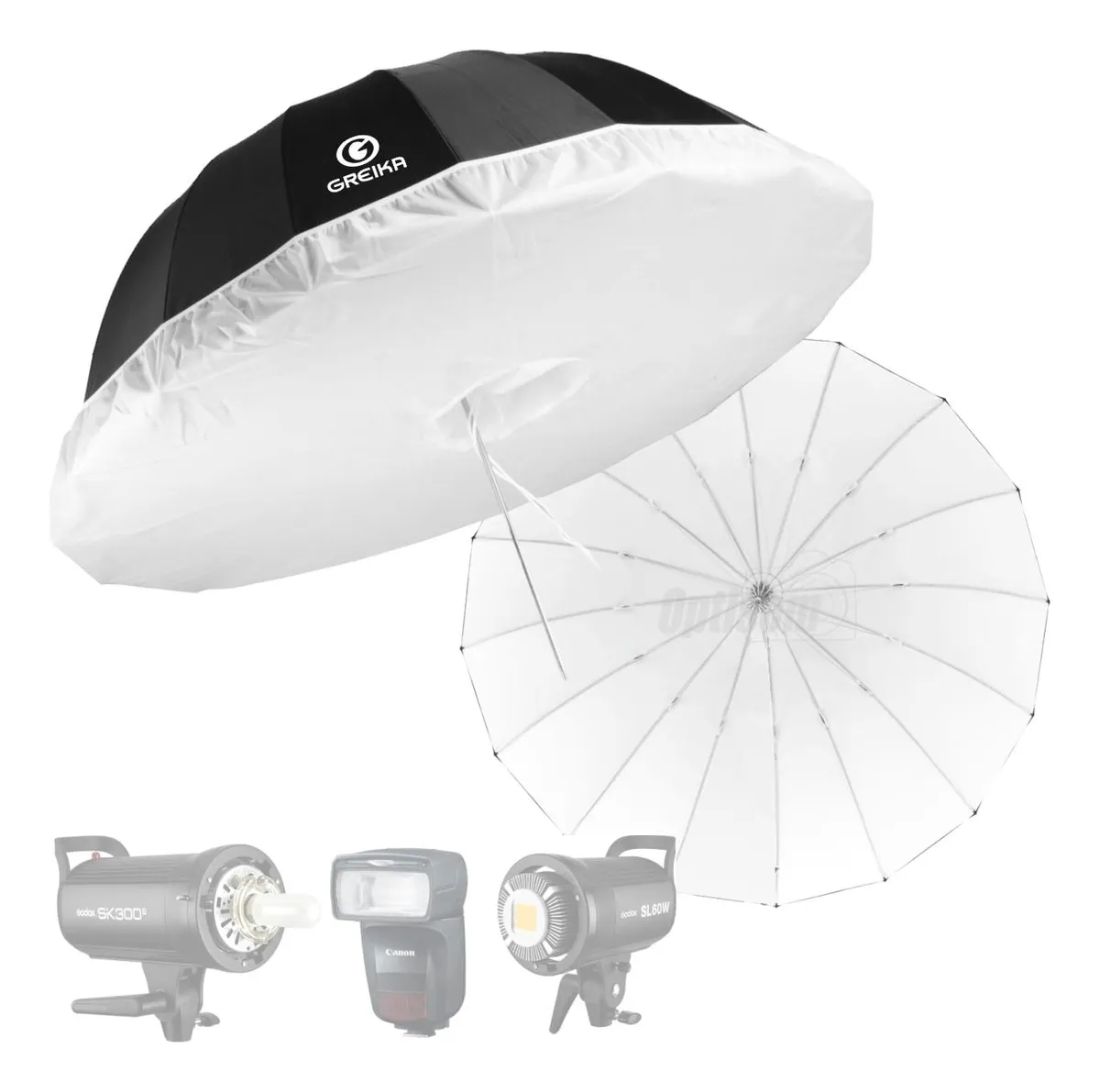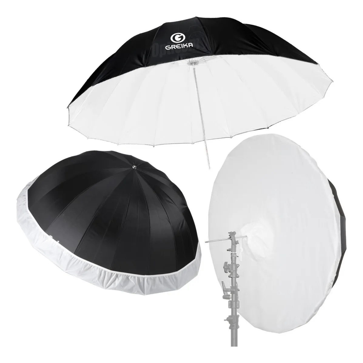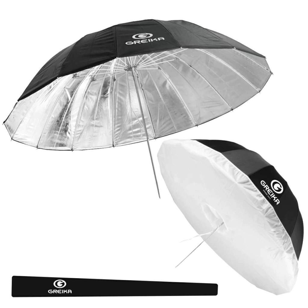 Sombrinha com capa difusora Preto Prata UR-08S180 Greika 180cm é feita em nylon e estrutura em de fibra, permitindo abrir e fechar sem quebrar.